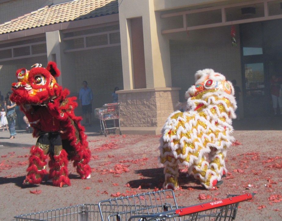 Much comforted, but ears still ringing, I made my way to the front. I wished the nice cashier a happy new year over the noise, paid, and headed toward the entrance–only to find a lion dance starting at the front door!